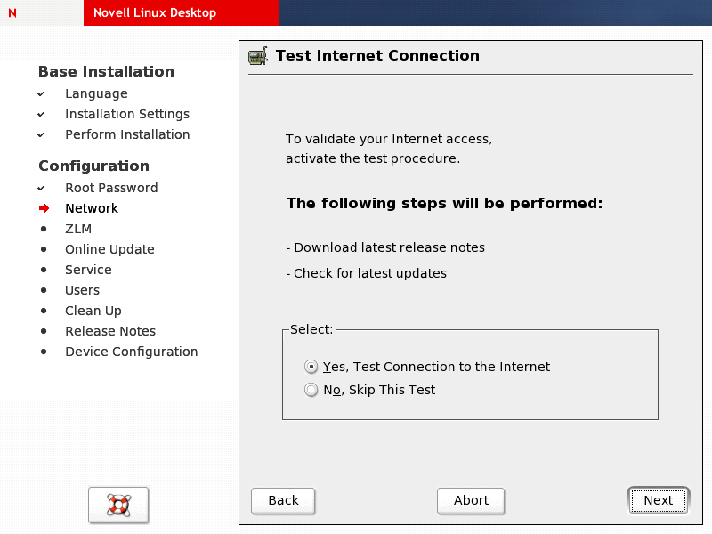 After your network has been set up correctly, YaST offers to let you test your Internet access by querying the Novell update server for software updates for NLD. Select and click to launch the activation dialog for ZENworks.