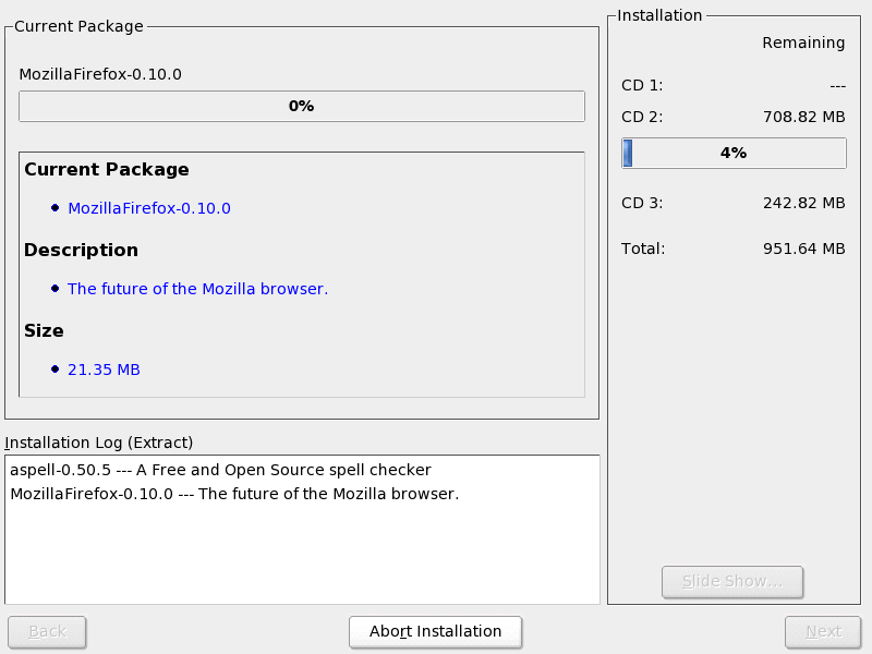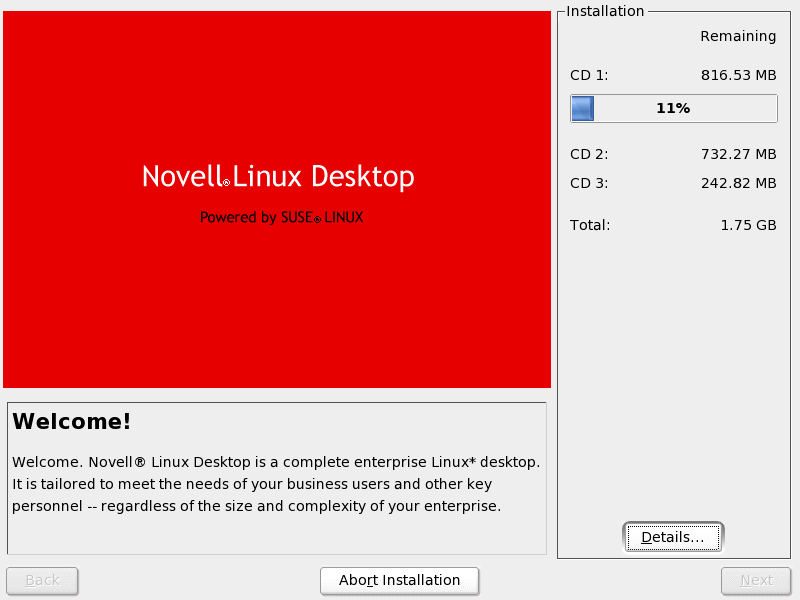 During package installation, you are shown a slide show highlighting the most important features of your Novell Linux Desktop system. The right side of the window displays some statistics on the media needed and the amount of data that needs to be transferred onto your hard disk. Click to view a detailed log of the packages currently being installed.