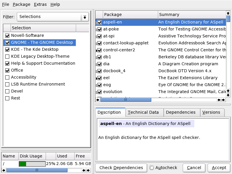 The right part of the package window displays the list of packages included in the recent selection and an information window on the currently selected package featuring a brief package description, technical data, packages dependencies associated with this particular package, and the package's version. To the bottom left, statistics for the current disk usage are displayed. To select an entire package selection, such as an additional desktop environment or Accessibility software, select (check) the package name in the Selection window on the left.