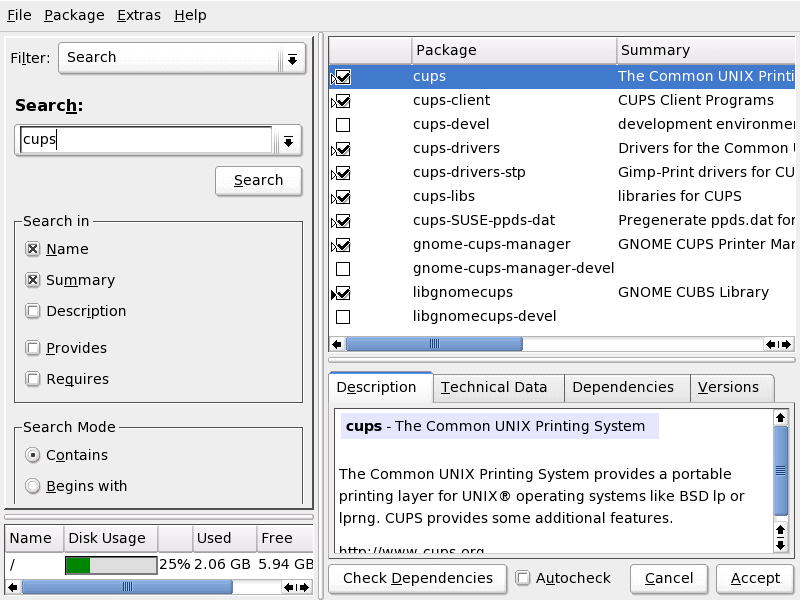To search for a particular package, switch the Filter setting from Selection to Search. Determine the scope and mode of your search and type the name of the package you are looking for or a binary or pathname included in this package.