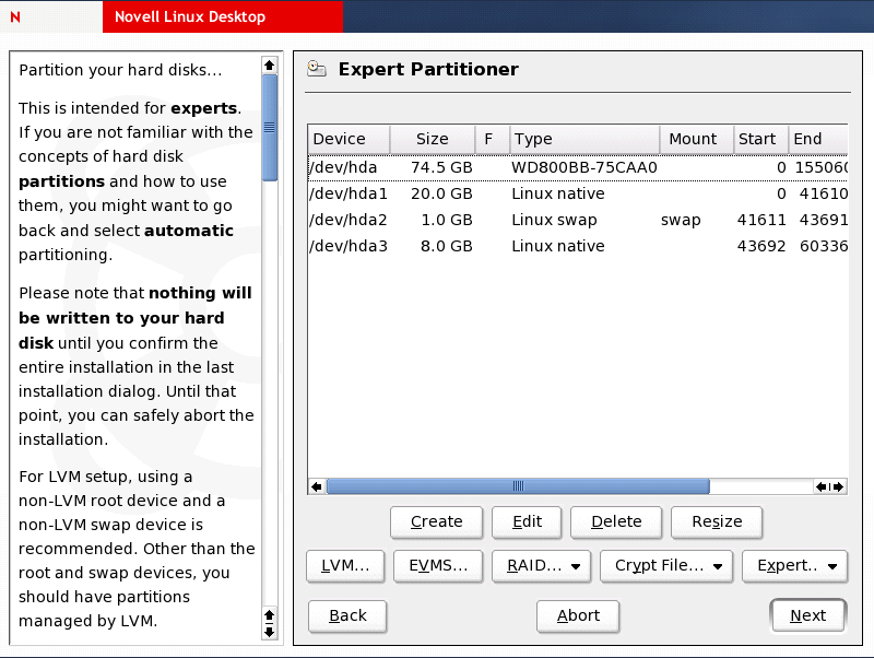 To create a whole new partitioning setup, select . The Expert Partitioner appears.
