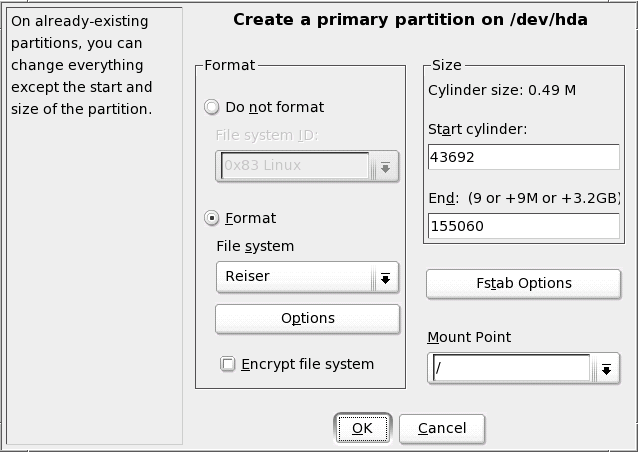 Set the partitioning parameters, such as file system ID, type, size, and mount point. If you are just creating a new Linux partition to hold additional data, select as the file system (the NLD default file system). For the size of the new partition just specify the end point of it; the start cylinder is assigned automatically. Finally, assign a mount point, if the partition is to be mounted into your installed system. If you don't want to include it right now, just omit the mount point. The partition appears in the partition table of the installed system, but it is not mounted by default.