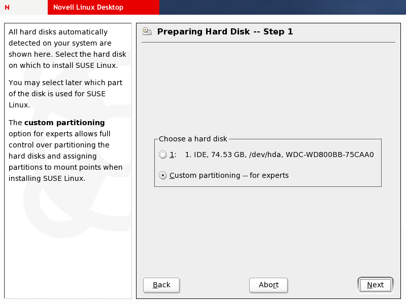 HINT:For detailed information on partitioning, turn to Section D.0, Partitioning. For an overview of Linux file systems, see “Chapter 18: File Systems in Linux” of the SUSE LINUX Enterprise Server 9 Administration Guide.