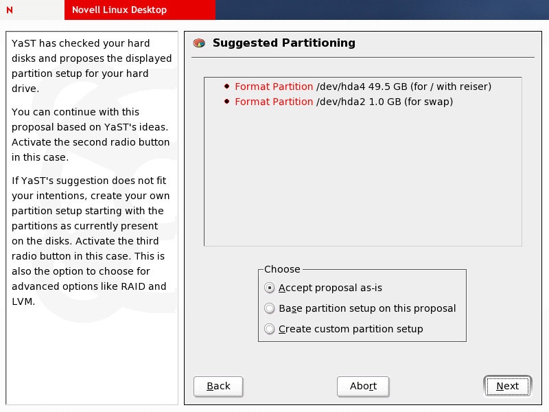 YaST displays the current partitioning suggestions.