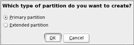 To create a new partition, select . In the next step, determine the type of partition you want to create. For detailed information on the partition types in Linux, turn to Partition Types.