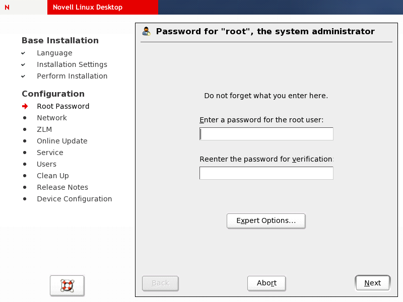 For verification purposes, the password for root must be entered twice. Don't forget the root password. When entered, this password cannot be retrieved.