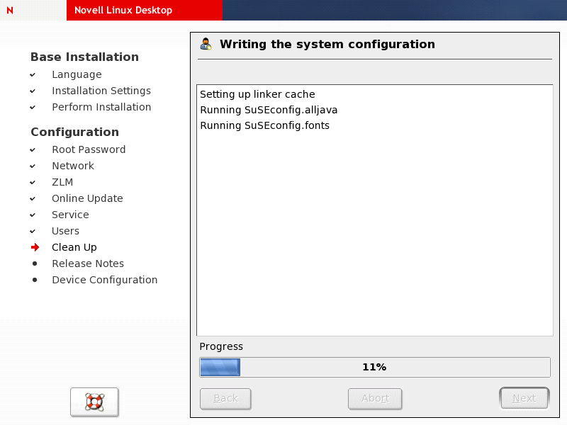 After you have completed the user configuration, the system rewrites the system configuration to make sure all your settings are applied. Wait until the SuSEconfig script is done. Depending on your hardware, this system initialization process might take a long time.