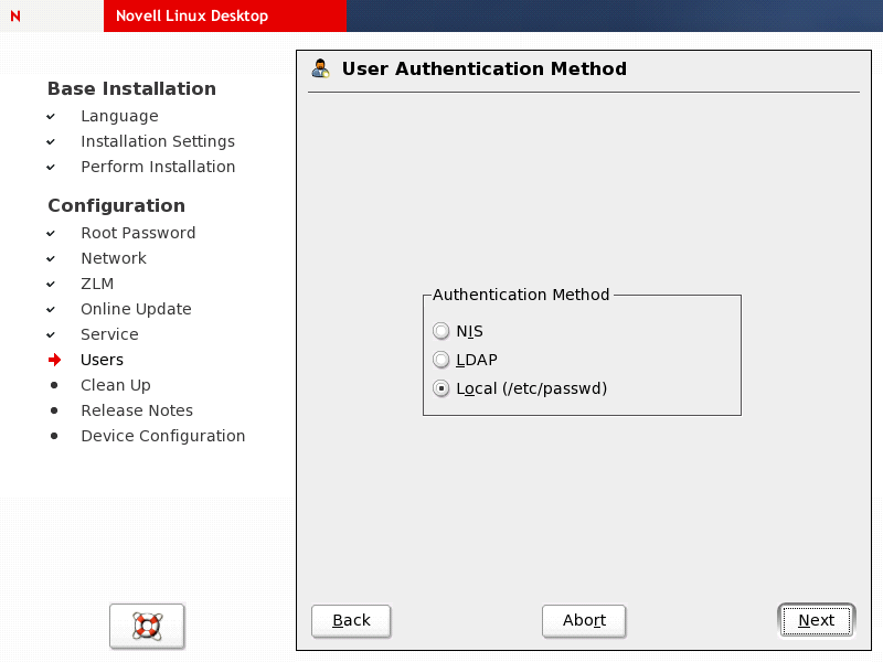 Select the appropriate user authentication method, then click . If you select NIS or LDAP, you are prompted for the server name.