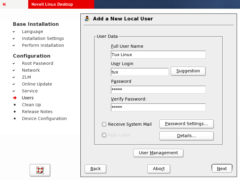 Specify the full username, a login name, and a password for the first local user. You can let YaST propose a user login name by clicking . Password handling is similar to the root user account.