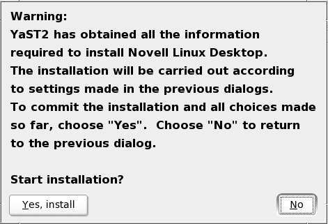 Having finished the package selection (and any optional boot loader configuration), you are returned to the Installation Settings screen. As soon as you have verified all other settings, click to launch the installation process. A prompt appears asking you to confirm this action.
