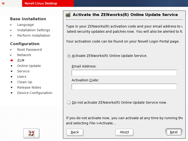 Novell Linux Desktop makes use of the ZENworks Online Update service. Before you can actually receive the patches and updates available for your NLD installation, you must provide the activation data you received upon purchase of NLD and the subsequent registration of your product.