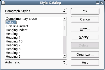 If you set the drop-down list at the bottom of this dialog box to , OpenOffice.org offers a selection of styles appropriate for the task at hand. If you select from the list, the Style Catalog displays all styles from the currently active category. In the previous figure, the category is Paragraph Styles. You can select a different category by clicking the drop-down list at the top of the dialog.