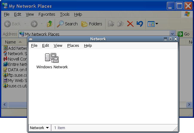 Figure 8 Comparing Windows My Network Places to Novell Linux Desktop Network