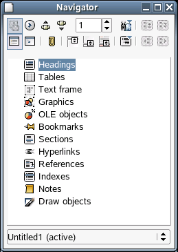 Open Navigator by clicking . The elements listed in Navigator vary according to the document loaded in Writer.