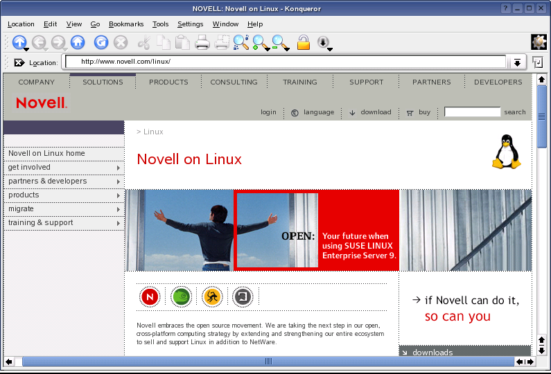 Enter a Web address in the Location field (for example, www.novell.com). Konqueror then goes to the address and displays the page. Entering the protocol (http://) at the beginning is optional, because it is recognized automatically by the program. However, this feature works reliably only with Web addresses. For FTP servers, type ftp:// at the beginning of the entry line.