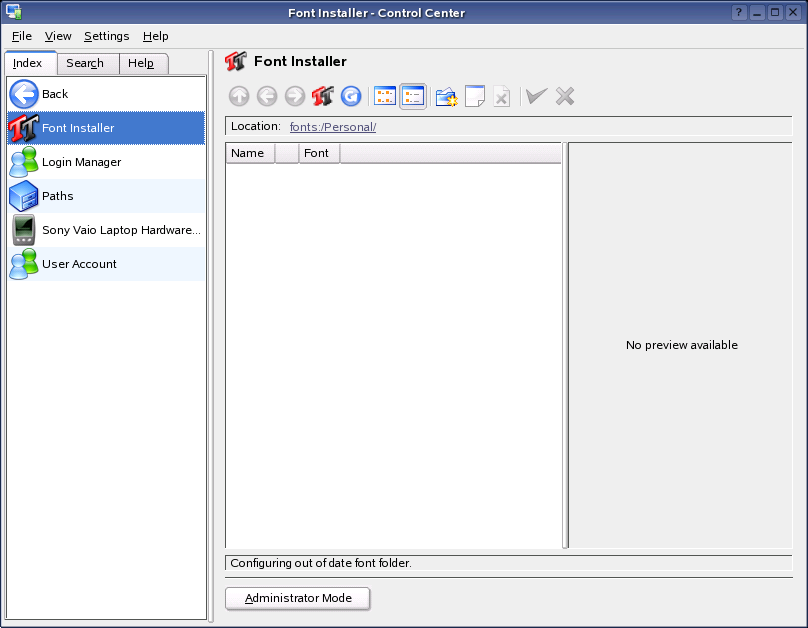 This module lets you configure both personal and system-wide fonts. You can install new fonts, delete old ones, and preview the fonts you have installed. By default, it displays personal fonts. To modify system-wide fonts, click Administrator Mode.