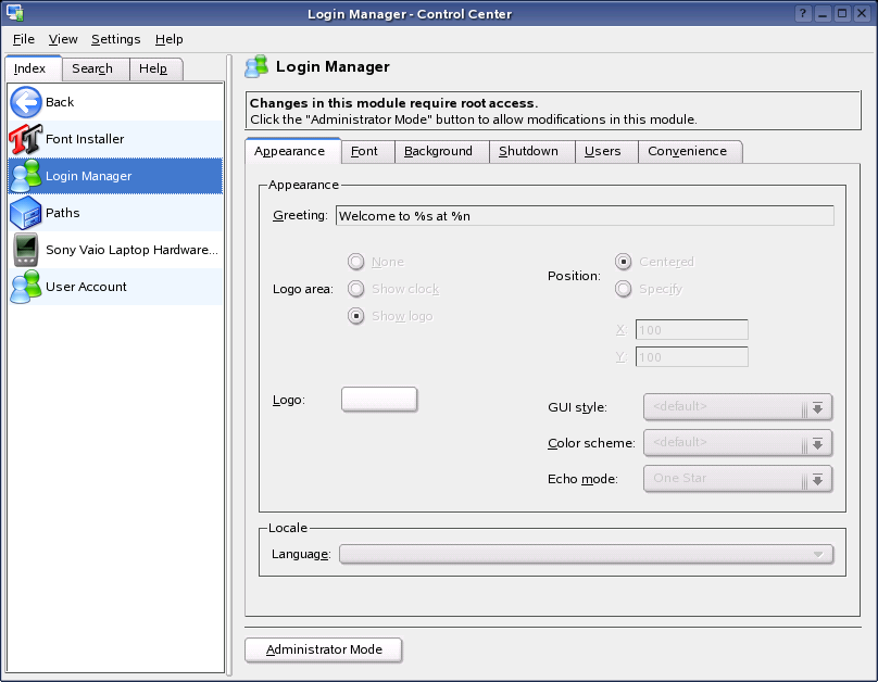Use the settings under the System Administration category to configure aspects of your system such as the boot loader and the kernel, and perform essential system tasks. Most of these sections require the root or Administrator password to make changes.