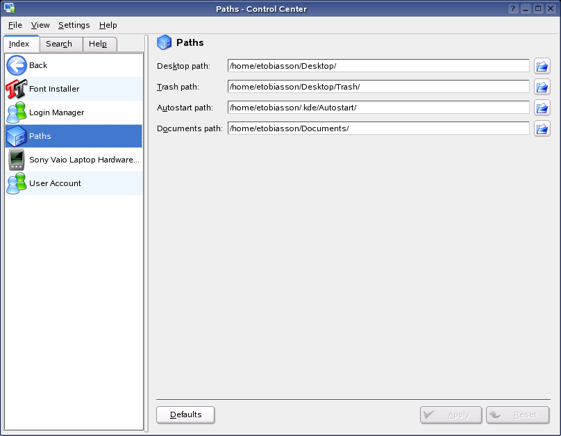 If you change the paths in the first three fields, the files in those locations are automatically moved to the new locations you specified. If the paths listed in this module do not exist when KDE is started, they are re-created.