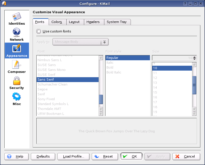 The settings in let you customize KMail according to your preferences. Click the tab to configure the fonts for the various displays, such as the message text and first-level quoted text.