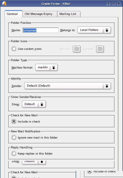 Message folders serve as an organizing tool for your messages. By default, all message folders are stored in the Mail folder in your home directory. The inbox, outbox, sent-mail, and trash folders are created when KMail is started for the first time.