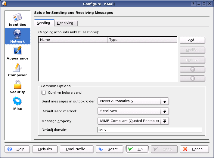 When KMail is started for the first time, a Mail folder is added to your home directory. This folder contains some basic mail directories (inbox, outbox, drafts, sent, and trash). Click to enter the information needed for sending and receiving messages. All configuration options can be accessed by clicking .