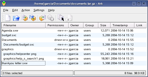 To save space on the hard disk, use a packer that compresses files and directories to a fraction of their original size. The application Ark can be used to manage such archives. It supports common formats, such as ZIP, TAR.GZ, TAR.BZ2, LHA, RAR, and ZOO.