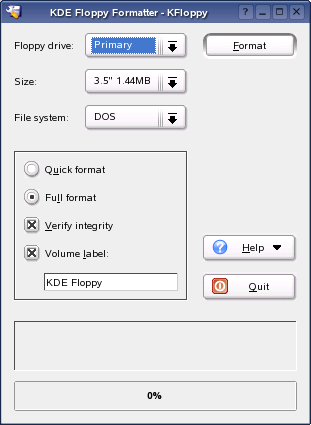 KFloppy is a floppy disk formatter. To launch KFloppy, click . From the Floppy Drive drop-down list, select or (if your machine has two floppy disk drives). The default setting for the size is 3.5” 1.44 MB. The setting for the file system is very important. Choose between the Linux format and . If you select MS-DOS, you can read and write the floppy disk on a Windows machine.