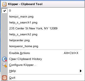 Help: Opens a submenu that accesses the Klipper handbook and other information about Klipper and KDE.