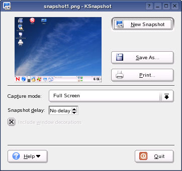 With KSnapshot, you can create snapshots of your screen or special applications. Start the program by clicking . The KSnapshot dialog consists of two parts. The upper area (Current Snapshot) contains a preview of the current screen and three buttons for creating and saving the screen shots. The lower area contains further options for the actual creation of the screen shot.