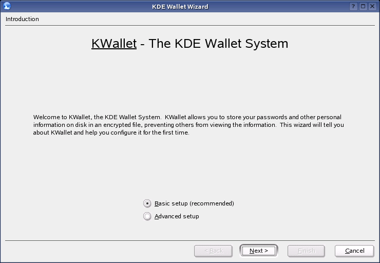 You can choose between Basic Setup (recommended) and Advanced Setup. If you choose Basic Setup, you can choose whether or not you want to store personal information. Some KDE applications, such as Konqueror or KMail, can use the wallet system to store Web form data and cookies. Click , enter a new password, then click Finish.