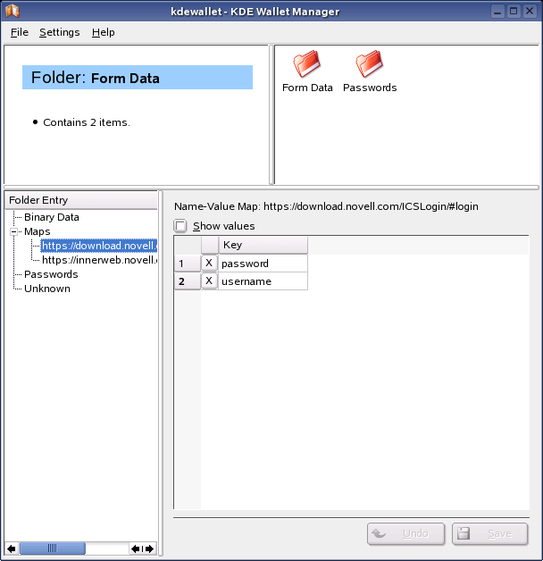 The kdewallet folder is the default folder for your passwords. Click to see the main window. It is divided into four different parts: the top left displays a summary, the top right displays subfolders, the lower left shows a list with folder entries, and the lower right shows the contents of a selected folder entry.