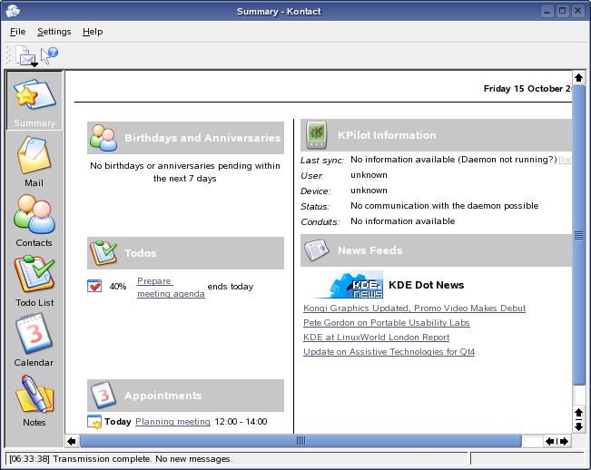 The Kontact application bundles the display of e-mails, notes, contacts, news, weather, and a calendar into one window. Kontact combines KDE applications such as KMail, KOrganizer (a calendar), and KaddressBook into a single interface, which provides easy access to your information.