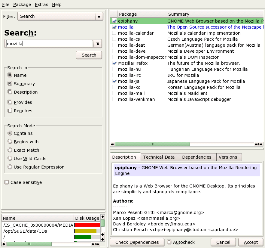 Table B-1 provides a listing of the RPMs required to provide language support for each feature (the KDE desktop environment, the GNOME desktop environment, the Mozilla browser, and the YaST configuration utility).