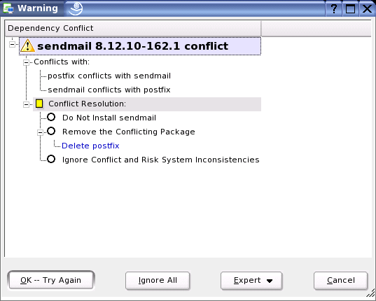 In the following example, sendmail and postfix may not be installed concurrently. Figure 26 shows the conflict message prompting you to make a decision. postfix is already installed. Accordingly, you can refrain from installing sendmail, remove postfix, or take the risk and ignore the conflict.