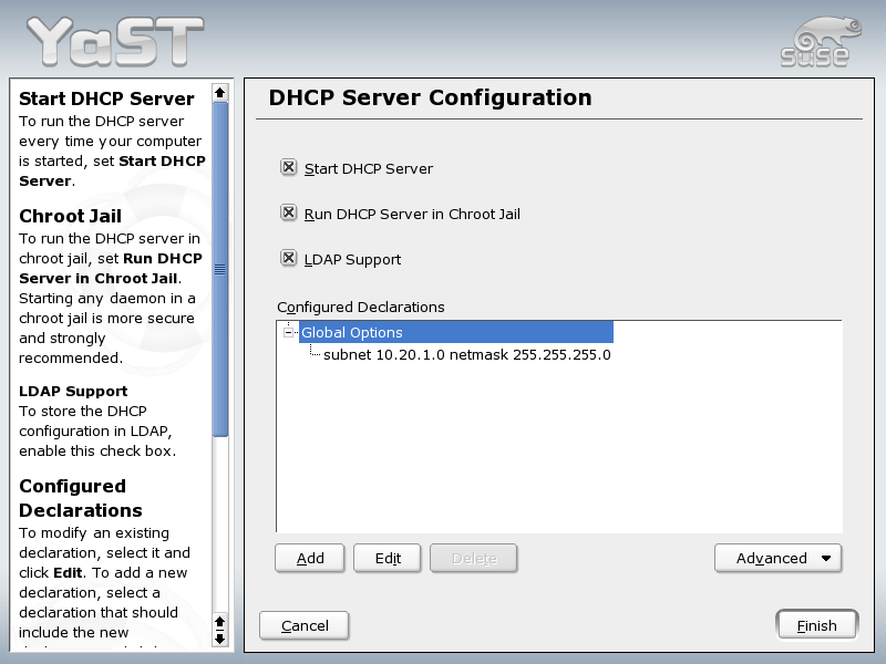 In this version of the SUSE LINUX Enterprise Server, the DHCP server as configured with YaST can be set up to store the server configuration locally (on the host that runs the DHCP server), or alternatively to have its configuration data managed by an LDAP server.