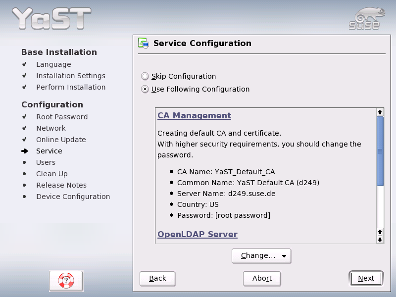 LDAP Server: You can run an LDAP service on your host to have a central facility managing a range of configuration files. Typically, an LDAP server handles user account data, but with SUSE LINUX Enterprise Server it can also be used for mail, DHCP, and DNS related data. By default, an LDAP server is set up during the installation. If you decide against the use of an LDAP server, the YaST mail server module will not work because it depends on LDAP functionality. Nevertheless, you can still set up a mail server on your system with the help of the Mail Transfer Agent module. Details about LDAP and its configuration with YaST are found in LDAP --- A Directory Service.