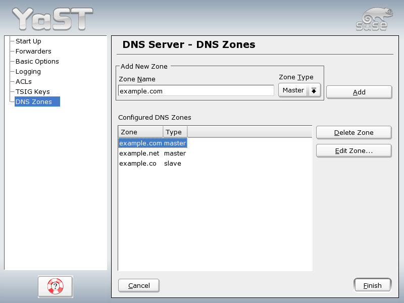 This part of the configuration uses several dialogs to configure the management of zone files (see Structure of Zone Files). For a new zone, provide a name for it in Zone Name. To add a reverse zone, the name must end in .in-addr.arpa. Finally, select the Zone Type (master or slave). See Figure 87. For each zone, set additional options after selecting Edit Zone ....