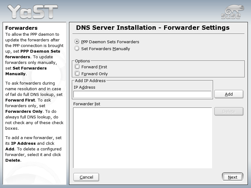 DNS Server Installation: Forwarder Settings: When starting the module for the first time, see the dialog shown in Figure 84. It allows you to decide whether the PPP daemon should provide a list of forwarders on dial-up via DSL or ISDN (PPP Daemon Sets Forwarders) or whether you want to supply your own list (Set Forwarders Manually).