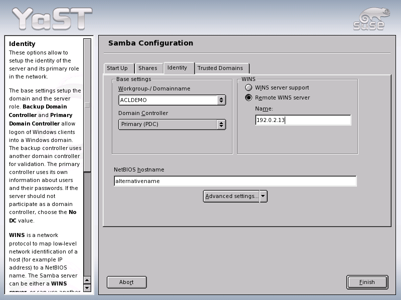In Identity (Figure 121), determine the domain with which the host is associated (Base Settings) and whether to use an alternative host name in the network (NetBIOS Host Name). If desired, configure the host as a WINS server. If this is not the case, specify the IP address of the WINS server. If you enter an asterisk (*), YaST automatically finds the WINS server.