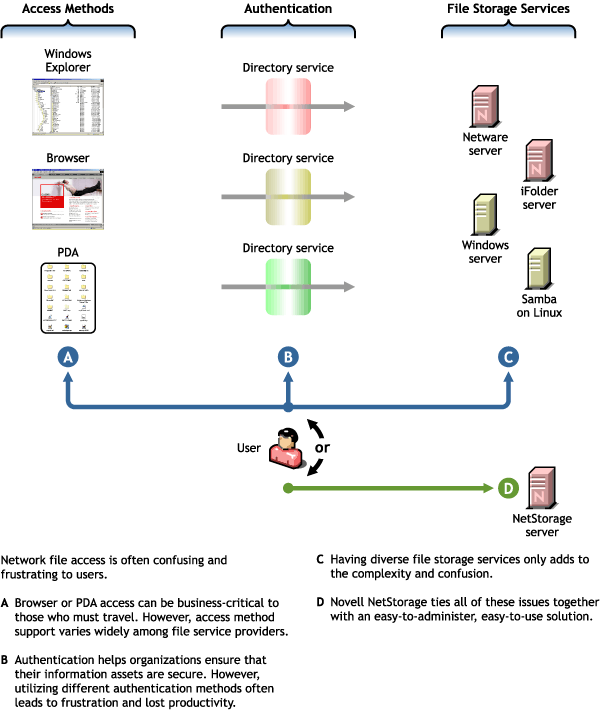 With Novell NetStorage, users can access and maintain their files on various types of storage systems from various access points, as illustrated in the following figure.