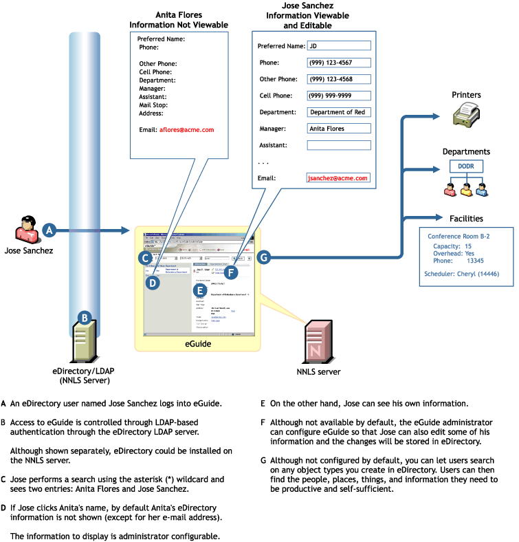 For example, the default eGuide installation in NNLS lets users search for the names of all eDirectory User objects on your system. It lets them see the details for their own User objects that are stored in eDirectory, but it doesn't let them modify the eDirectory information. If they access other User objects, they can see only the e-mail address attributes associated with those objects.