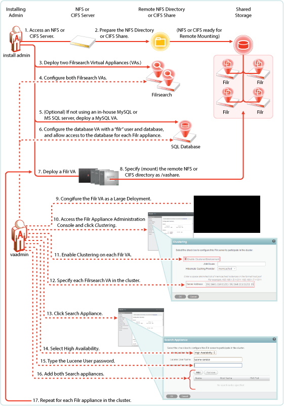 Filr clustering involves two or more Filr VAs sharing the same NFS or CIFS data storage location (/vashare). You can only create a cluster if your Filr appliances were deployed pointing to the same /vashare disk.