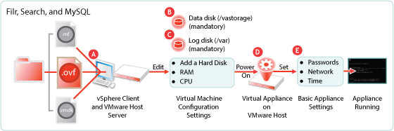 If you are installing separate appliances, you need to deploy at least one and preferably two search appliances as well. The process is very similar to a Filr VA deployment, except that the search appliances don’t use shared storage. |