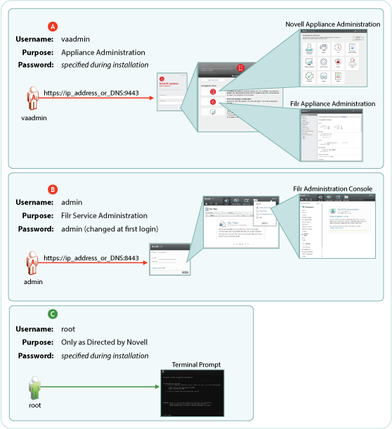 Because Filr is an appliance that is installed and administered in different phases, you install and then administer Filr using two different administrative users to provide separation of duties. Each user utilizes different Web-based administrative tools, as illustrated in Figure 3-1 and explained in the table that follows it.