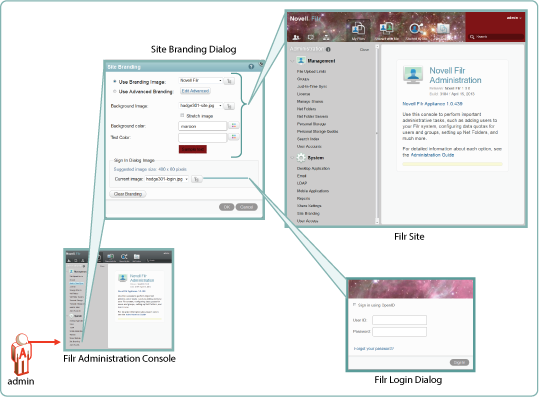 You can customize the colors and images displayed on the Filr site and the login dialog box, as illustrated in Figure 3-5. Customizations are retained when Filr is upgraded. For more information, see Setting Up Site Branding