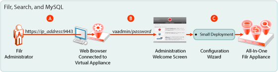 Finally, access and configure the Filr appliance through an administrative browser, logging in to the administrative console, and running the configuration wizard. For more information, see When you finish this step, your virtual appliances are all running and working with each other, providing your network with Filr services. |