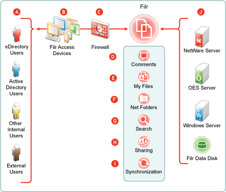 Figure 1-2 shows Filr’s main features in the context of your existing network infrastructure. The table that follows the figure briefly describes each feature and how all of the components shown fit together to provide Filr services.