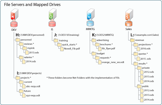 To understand Net Folders, it is useful to see the similarities and differences between them and the mapped drives that you probably have on your current network. Figure 10-1 and Figure 10-2 illustrate such a comparison.
