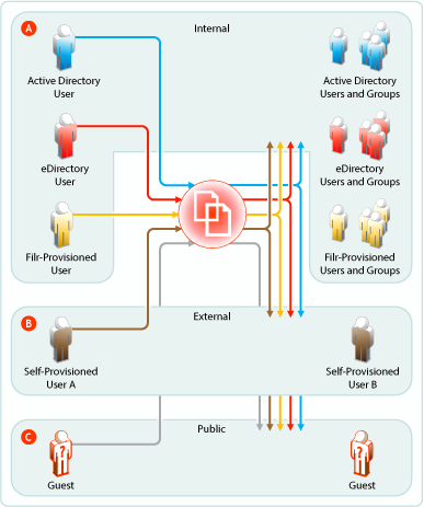 Depending on the sharing privileges they are granted, internal users can share and collaborate with each other, with external users who have been invited to self-provision into the Filr system, and with the public. This means that eDirectory users can share files with Active Directory users and groups, that the reverse is also true, and that both of them can invite external partners or others to join the Filr system for collaboration and other purposes. If re-sharing items is allowed, those who receive share invitations can also share. |
