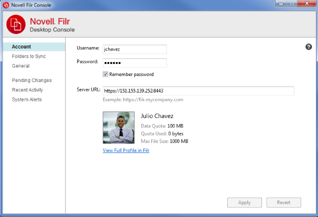Click Account in the Novell Filr Console dialog box.